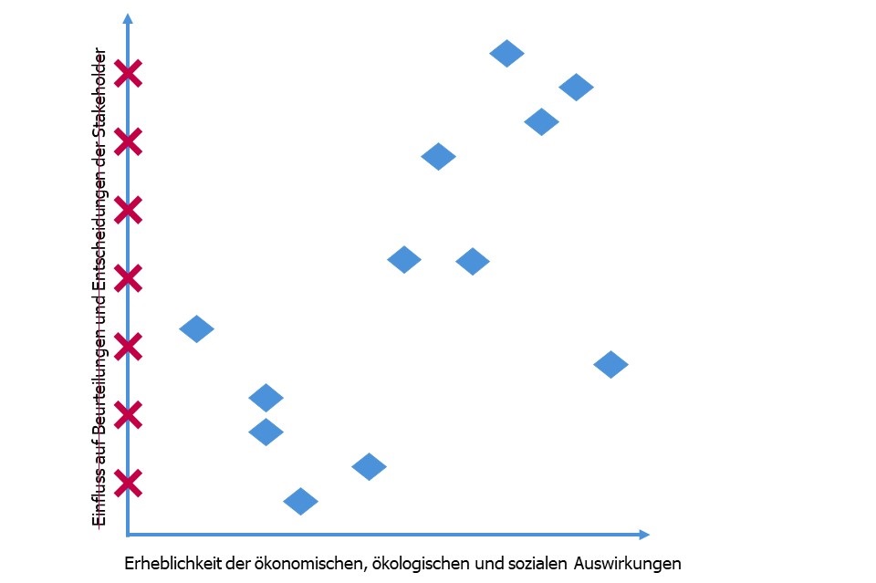Anstelle der bisherigen zweidimensionalen Wesentlichkeitsanalyse bzw. -matrix zur Ermittlung der wesentlichen Nachhaltigkeitsthemen, über die ein Unternehmen zu berichten hat, stehen neu (eindimensional) die Auswirkungen (impacts) des Unternehmens auf Wirtschaft, Umwelt und Menschen im Zentrum.